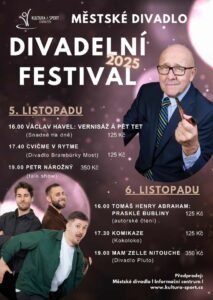 Středa 6. listopadu nabídne odpolední autorské čtení Tomáše Henryho Abrahama s názvem Prasklé bubliny. Autor představí své nové texty, které balancují mezi poezií, esejí a dramatickým monologem. Následovat bude představení Komikaze souboru Kokoloko, které přináší absurdní humor, grotesku a nečekané zvraty. Festival uzavře klasická operetní komedie Mam’zelle Nitouche v podání Divadla Most — inscenace, která spojuje hudbu, humor a divadelní tradici.