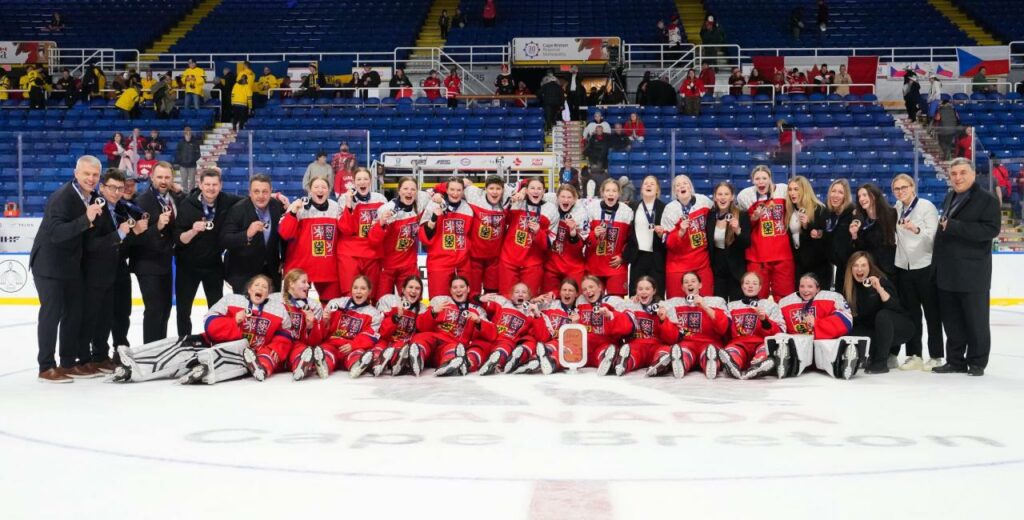 Česká reprezentace žen U18 po zisku medaile na mistrovství světa v Kanadě. Mezi oporami týmu byla i klášterecká brankářka Lili Chmelařová, která výrazně přispěla k historickému úspěchu. Foto: klasterec.cz