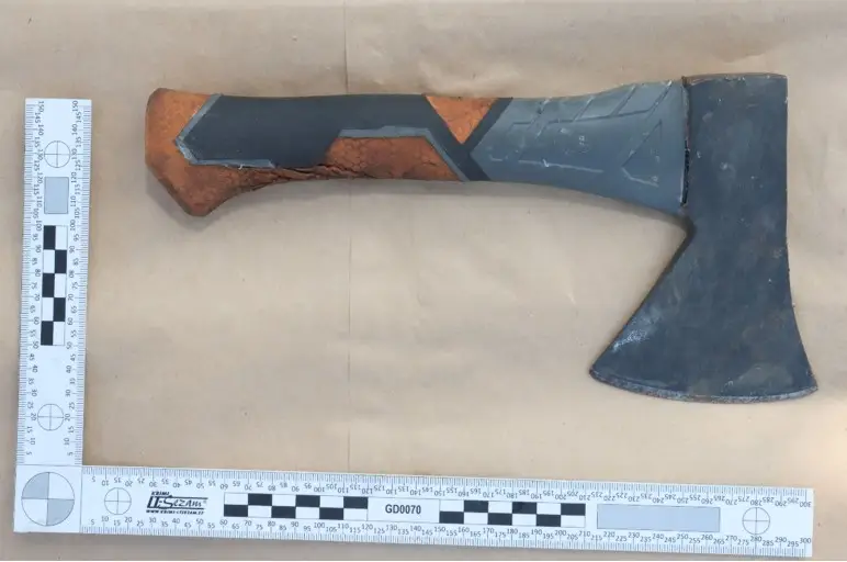 Sekera, kterou měl útočník v ruce při loupežném napadení v Kadani. Policie ji zajistila jako důležitý důkazní materiál. Foto: PČR