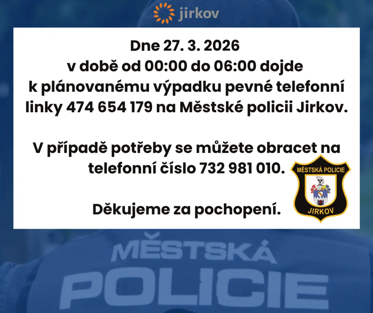 Obyvatelé Jirkova by měli zbystřit. V noci z 26. na 27. března dojde k plánovanému výpadku hlavní telefonní linky Městské policie...