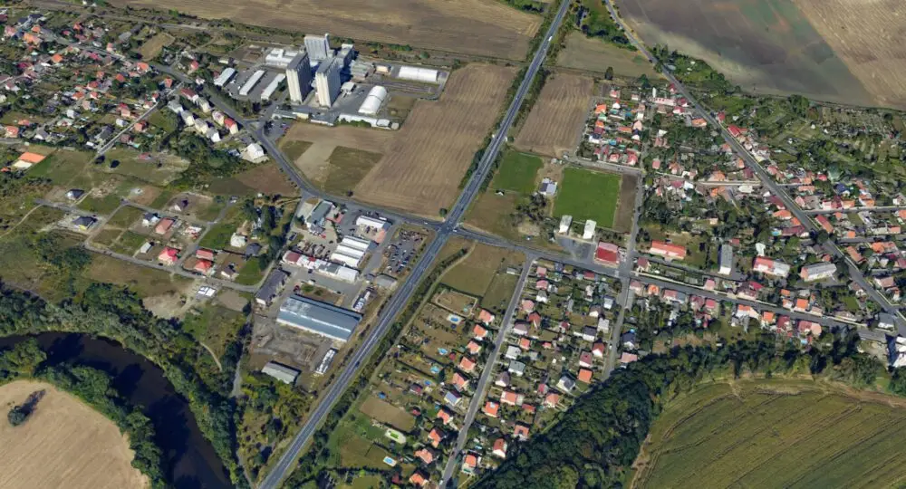 Letecký pohled na Dobroměřice a jejich okolí — propojení venkovské krajiny, zemědělských polí a hlavního silničního tahu mezi Louny a Mostem. Místo, kde se potkává klid vesnice s ruchem dopravy a kde brzy vznikne nová okružní křižovatka. Foto: ŘSD