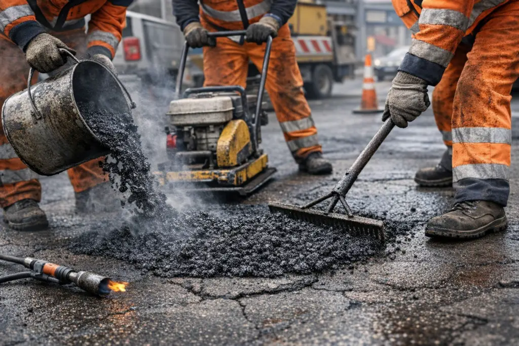 Pracovníci Technických služeb města Chomutova opravují výtluky teplou obalovanou směsí. Detailní záběr ukazuje ruční rozprostírání a hutnění horkého asfaltu, který po zimě nahrazuje provizorní opravy. Ilustrační foto: Redakce