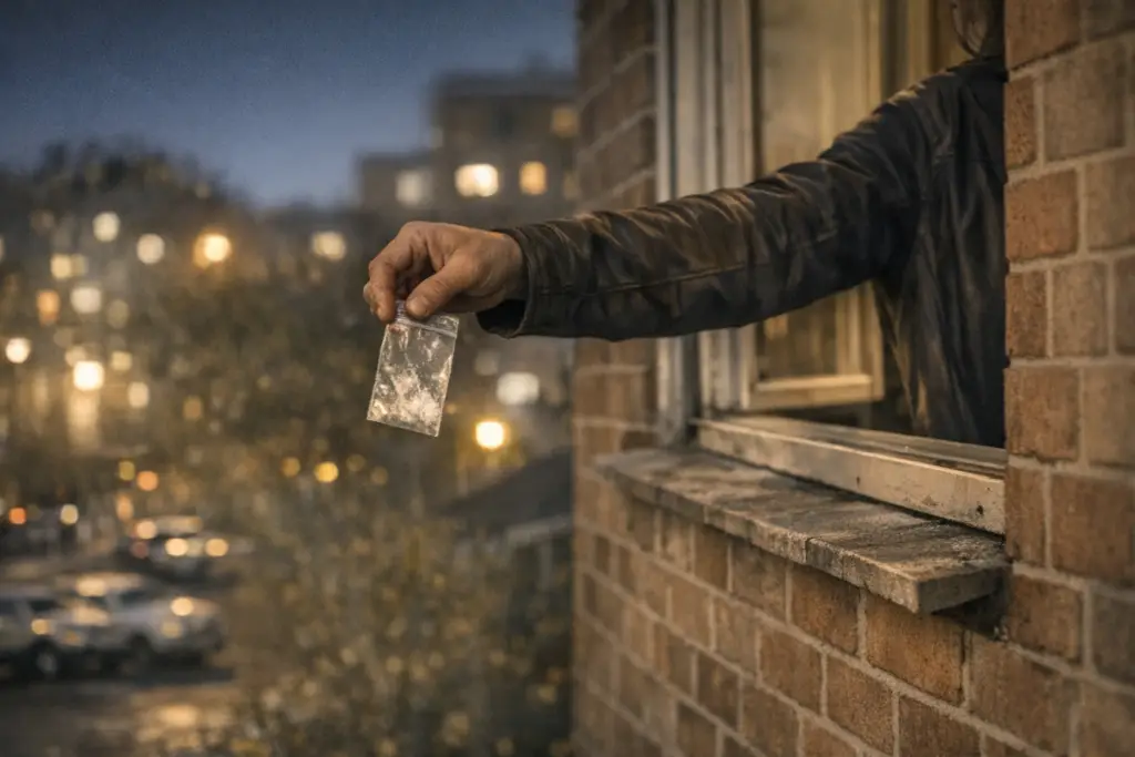 Kriminalisté se rozhodli zasáhnout minulý týden v noci. Jeden z nich sledoval dalšího zákazníka, který přišel k oknu a zaklepal klacíkem. Podezřelý se objevil, krátce promluvil, zmizel v bytě a po půl minutě znovu otevřel okno. V ruce měl balíček.